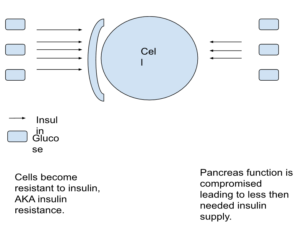 As we described above, diabetes is a confluence of two conditions, cells becoming unresponsive to insulin and the pancreas not producing enough insulin. The combined effect of the two phenomena is that insulin production cannot clear glucose from the bloodstream. The lingering glucose thus causes widespread deterioration of all tissues across our body. Although both conditions need to coexist for diabetes to occur, their onset is not simultaneous but sequential.