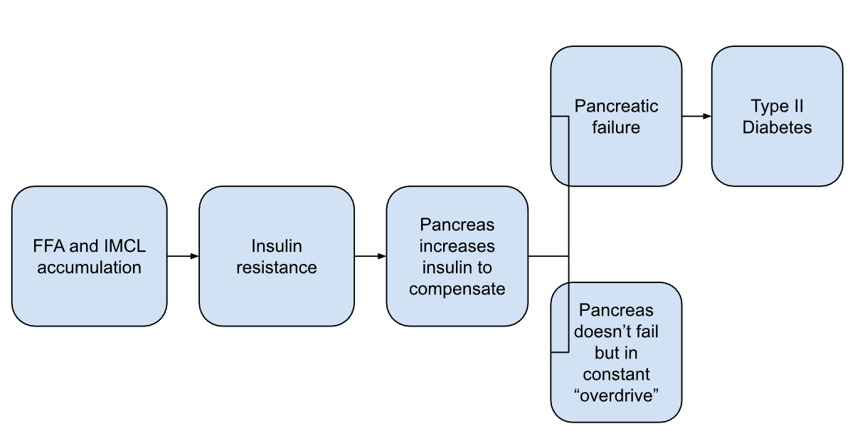 As explained earlier, diabetes begins insulin resistance starts to occur due to toxins secreted by free fatty acids (FFAs) and intramyocellular lipid (IMCL) accumulation. These toxins affect the cells’ ability to respond to insulin and thus prevent them from being able to absorb glucose that is circulating in the blood. In simple words, when insulin resistance occurs, insulin becomes less effective as the “key” for glucose to enter cells. Therefore to uncover the origins of insulin resistance, we must first understand the root cause of fat accumulation. Specifically, the build-up of FFAs and IMCL can be traced back to two factors: